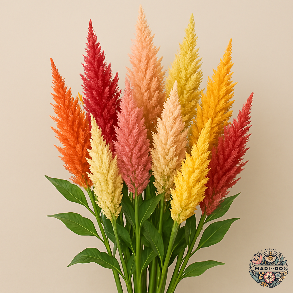 ✨ Celosia 'Pampas Plume' (celosia argentea plumosa) – Feathery plumes in sunset shades of scarlet, gold, pink, and cream. ✨
